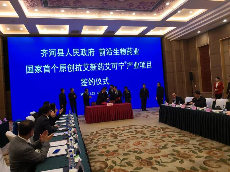 11月29日,齐河县在济南举行国家首个原创抗艾滋病新药艾可宁(艾博韦泰)产业项目签约仪式暨新闻发布会,齐河县人民政府与前沿生物药业股份有限公司签约共建艾可宁产业基地,标志着这一国家科技重大专项成果、中国首个原创抗艾滋病新药在齐河实现产业化,这也是该公司建设的第一个艾可宁生产基地,对促进德州齐河乃至全省医药健康产业发展将起到极大推动作用。项目投资14亿元,预计2022年建成投产运营,投产后3年内销售产值可达10亿元,10年内可达100亿元。