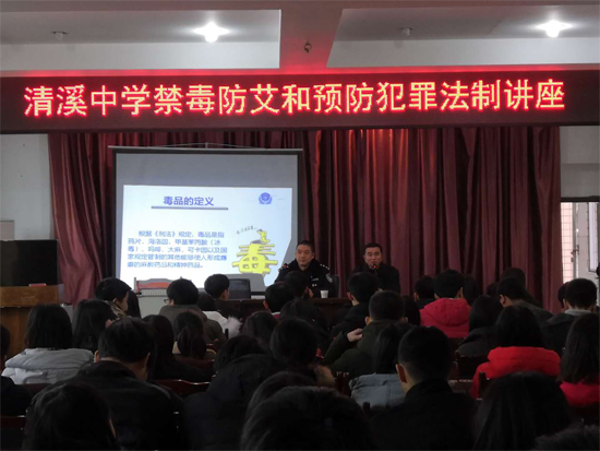 四川新闻网达州1月9日讯(刘星宏)为进一步加强依法治校,加大校园禁毒防艾和预防犯罪宣传力度,丰富青少年学生的法律知识,营造人人参与普法工作的良好氛围,1月8日下午,渠县清溪中学特邀法制校长、清溪场镇派出所所长廖洪波同志上了一堂“禁毒防艾和预防犯罪”的普法知识讲座。讲座由该校分管德育工作副校长方强主持。