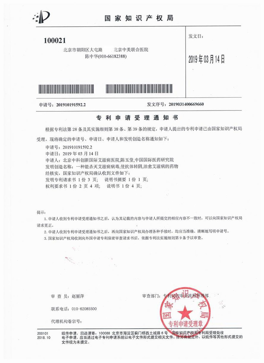 北京中科创新国际医院发明了一种能杀灭艾滋病病毒,使抗体转阴,治愈艾滋病的药物[艾滋1号],现已通过中国国家知识产权局申请发明专利。本发明涉及一种能杀灭艾滋病病毒,使抗体转阴,治愈艾滋病的药物[艾滋1号]为纯中药制成,具有治疗效果好,副作用小,疗程短等诸多优点;有增强人体自身免疫力,杀灭艾滋病病毒的功效,使HIV抗体转阴,能彻底治愈艾滋病的特点。治疗艾滋病及艾滋病并发的各种疾病有见效快,治愈后不复发的特点。30天为一个疗程,一般一个疗程见效,三个疗程左右可以治愈。