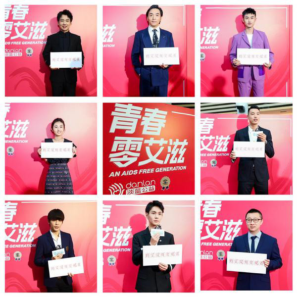 在年轻影响力·中国青年明星公益榜样盛典上,郭麒麟、吴牧野、陆宇鹏、张子枫、翟晓川、马雪阳、蒋梓乐等青年明星公益代表与淡蓝公益创始人耿乐,共同为“青春零艾滋”举牌