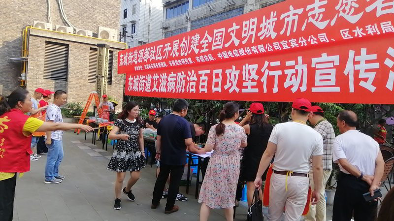 四川新闻网宜宾6月9日讯(刘安安)为全面深入有效推进艾滋病防治工作,全力打赢艾滋病防治工作攻坚战,确保东城街道各项艾滋病防控措施落实落地,“两零三降”工作目标圆满完成,6月4日上午,东城街道开展了2019年艾滋病防治百日攻坚行动宣传活动。街道领导、卫计办、民政办、综治办、团工委、社事中心、便民服务中心等部门负责人和社区志愿者共100余人参加了活动。