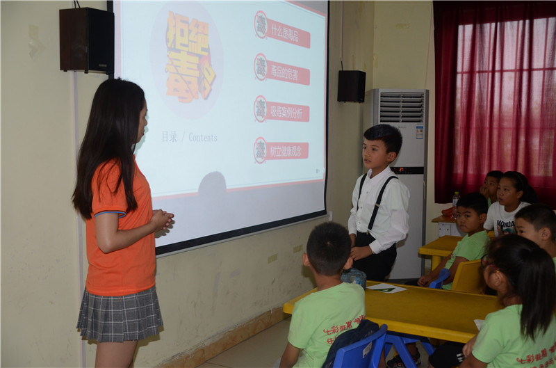 课堂上,山东科技大学文法系学生代芯从“什么是毒品”、“毒品的危害”、“吸毒案例分析”、“树立健康观念”四个方面进行讲解,并就“毒品的种类与危害”与留守儿童进行讨论。同时用生动的ppt与真实案例影片将毒品的危害展现出来。课后,团队成员与孩子们进行互动,告诉孩子们拒绝接受陌生人的“馈赠”、不盲目追赶时髦、慎重交友、不轻信他人、远离易染毒场所,团队其他成员及济宁市运河义工服务协会部分志愿者现场辅助教学。
