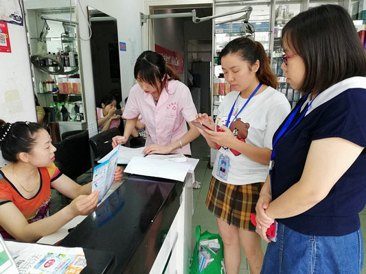 “请问您知道艾滋病的传播途径有哪些吗?你清楚店里哪些物品有可能成为艾滋病的传播载体吗?”每到一处,工作人员都认真询问店内工作人员对艾滋病防治知识的了解情况,并通过发放宣传资料、现场解答疑问等方式,主动向店内工作人员和顾客宣传艾滋病防治知识,引导大家正确认识和防范艾滋病。同时,工作人员还认真指导店主如何规范店内务品摆放、使用、清洁、消毒和填写记录等,引导工作人员按规定做好物品清洁消毒和记录填写,以便进一步提升防艾意识。