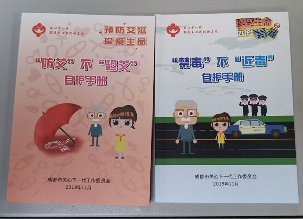 【成都市关工委向现场学生赠送禁毒和防艾自护手册。这两本“口袋书”,是“老关爷爷”邀请教育、疾控、公安等相关部门人员,根据发放对象的年龄特点专门编写的。】