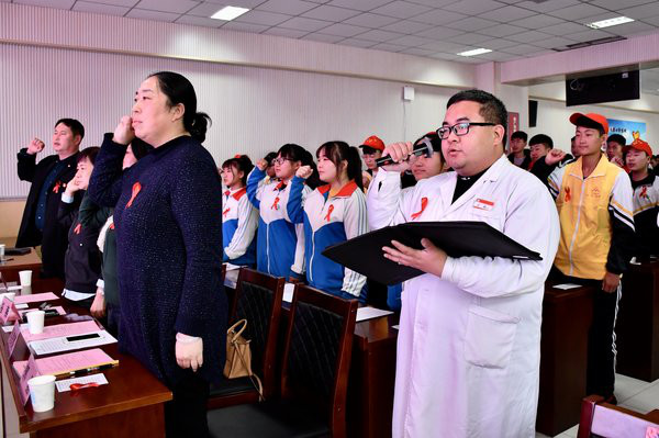 学校学前教育学生充分发挥积极性和创造性,为此次活动创作了防艾主题作品。并由学生代表上台就作品创意和対防艾志愿活动的期待,发出了青年人声音,表达对防治和抗击艾滋病的坚定支持和共同期待。随后,职业学校青年志愿者社团指导教师、学校校医苏祺老师带领全体与会人员,誓声铿锵有力彰显出学校师生志愿防艾的决心。