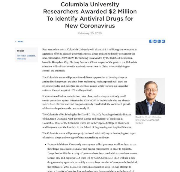 新冠肺炎疫情在武汉爆发以来,何大一以及哥伦比亚大学不少科研工作者都高度关注,很多相关的科研工作也已经着手展开。围绕此次合作,哥伦比亚大学已经组建了一支由病毒学家、分子生物学家、化学家等多种专业人员组成的科研团队,将用四种不同的方法来开发药物或抗体进而阻止病毒的复制。这群世界级的科学家和工程师来自瓦杰洛斯外科医师学院和工程与应用科学学院,其中多人还是亚伦·戴蒙德艾滋病研究中心的资深成员。