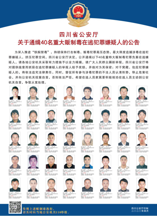 图为《四川省公安厅关于通缉40名重大制毒贩毒在逃犯罪嫌疑人的公告》。中国禁毒网发