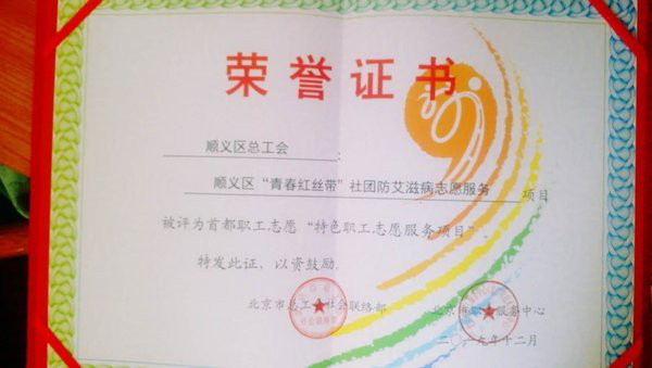 近日,顺义区疾控中心“青春红丝带”社团艾滋病志愿者服务队代表区总工会参加由北京市总工会组织的首都职工志愿服务评选活动,荣获2019年度“特色职工志愿服务项目”。