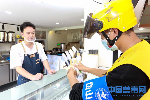 6月23日,在浙江省舟山市岱山县一家餐饮店里,外卖骑手将禁毒宣传单放进外卖包裹里。邹训永 摄