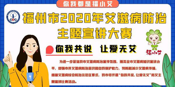 福州市健康委员会、福州市疾控中心、福州广播电视台定于2020年6月-12月联合举办“你我共说.让爱无艾”首届防艾宣讲大赛。