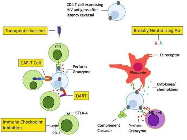 免疫疗法是指通过人为调节机体的免疫功能,达到抑制病毒,控制疾病进展的目的。作为新兴技术,免疫疗法已应用于自身免疫病、肿瘤、器官移植等多个领域,并取得了较好的治疗效果。已用于艾滋病领域的免疫疗法包括治疗性疫苗、广谱中和抗体、HIV-1特异性T细胞治疗、CAR-T细胞治疗、免疫调节治疗等。免疫疗法在灵长类动物模型中能够有效控制病毒储存库,抑制停药后的病毒反弹。然而现有研究结果表明,仅仅采用一种免疫治疗方法很难完全抑制宿主体内病毒,甚至有加速突变毒株的复制和耐药的风险。几种免疫疗法联合应用策略可以大大减少这种情况发生,有利于达到功能性治愈的目的。