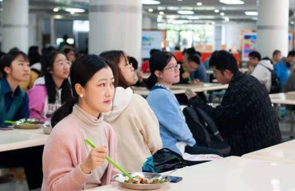图为华南理工大学在食堂播放防艾公益影片