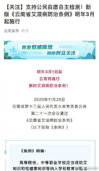 据“云南发布”消息,明年3月1日起,云南将施行新的艾滋病防治条例。