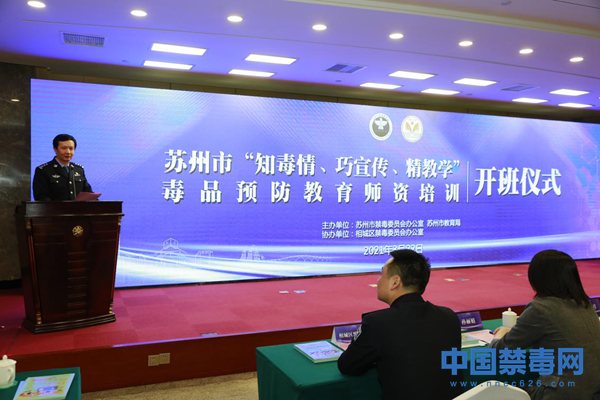 3月22—23日,苏州市禁毒办开展“知毒情、巧宣传、精教学”毒品预防教育师资培训。图为苏州市禁毒委副主任兼禁毒办主任、公安局党委委员、副局长冯晋讲话。中国禁毒网发