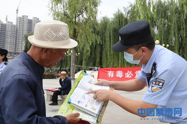 图为禁毒民警向群众讲解禁毒宣传册。中国禁毒网发