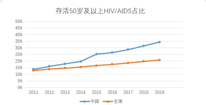 UNAIDS报告截至到2019年底,全球50岁以上存活艾滋病病毒感染者及病人达790万,占全部感染者及病例的21%。我国报告存活33万余,占全部感染者及病例的34%,远高于全球平均水平,占比上升的趋势与较早开始艾滋病流行的欧美国家相近,美国2016年即以超过50%。近10年我国报告艾滋病病毒感染者及病人50岁及以上病人占比的变化趋势可见,占比在逐年增加,由于抗病毒治疗覆盖面加大,病人存活时间延长,早期感染的病人在逐渐变老。