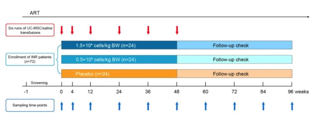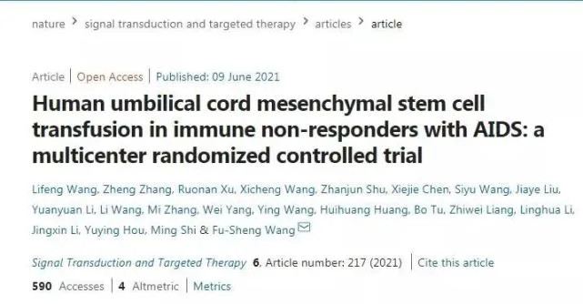 近日,在前期研究基础上,王福生院士团队在《信号转导与靶向治疗》上发文,其研究发现, 脐带间充质干细胞(MSCs)输注治疗“免疫重建不良”的艾滋病患者安全且耐受,患者CD4+ T细胞计数显著增加。
