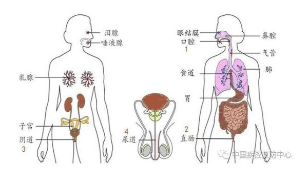 艾滋病的母婴传播和性接触传播主要由生殖器官分泌释放的液体充当HIV传播的载体。虽然这些分泌液中的病毒不能通过皮肤入侵人体,但可以通过各种粘膜入侵人体。已知HIV入侵的粘膜部位较多,包括:1)上消化道粘膜。如HIV阳性母亲乳汁可与婴儿口腔、咽喉、食道和胃粘膜接触。2)直肠粘膜。如HIV阳性个体的精液可与直肠粘膜接触。3)女性生殖道粘膜。如HIV阳性个体的精液可与阴道、子宫及输卵管粘膜接触。4)男性生殖道粘膜。如HIV阳性个体的阴道分泌液可与男性尿道粘膜接触。