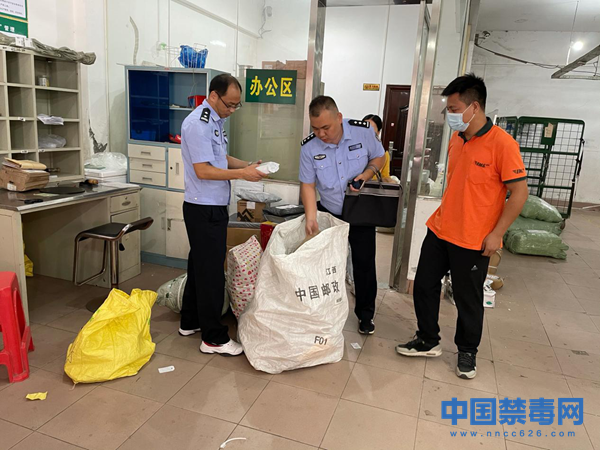 图为民警检查邮政快递营业网点。中国禁毒网发