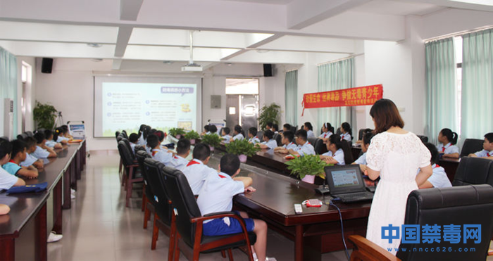 图为禁毒专干向学生播放禁毒宣传PPT。中国禁毒网发