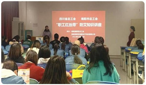 为提高广大职工的艾滋病防治知识水平,引导职工树立健康意识,养成良好的行为和生活方式,10月25日,由四川省总工会、绵阳市总工会主办,高新区总工会承办的“职工红丝带”防艾知识讲座在绵阳高新区恒奥电子科技有限公司举行。共有50余名职工参加了此次防艾讲座。