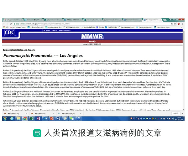 1981 年 6 月 5 日,美国 CDC 在《发病率与病死率每周报告》上发表了一篇题为《卡氏肺囊虫肺炎——洛衫矶》的文章。