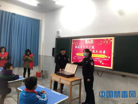 图为民警向学生展示毒品仿真模型。中国禁毒网发