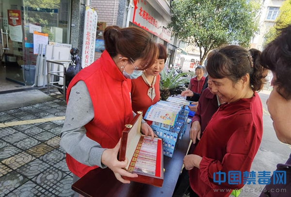 图为禁毒社工向群众展示毒品仿真模型。中国禁毒网发