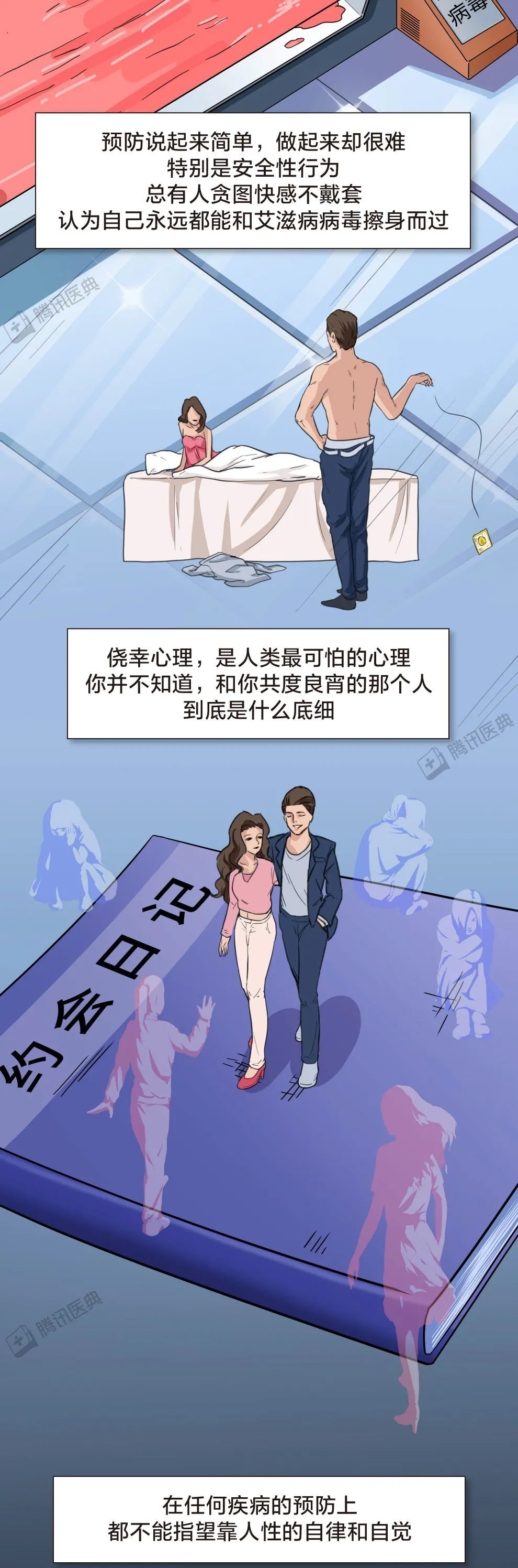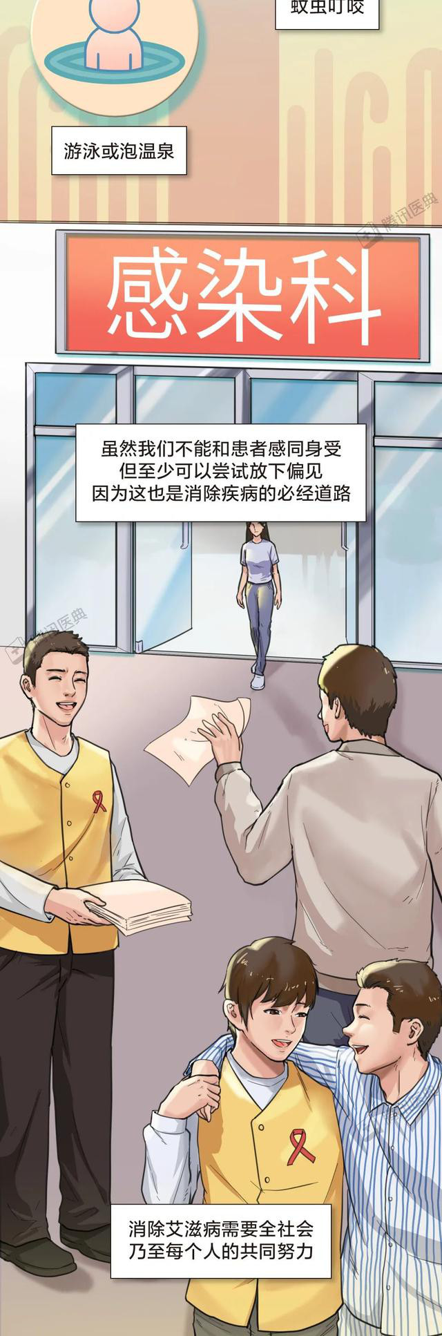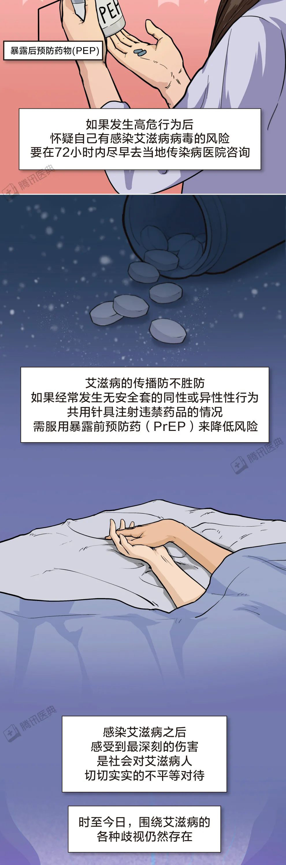 所以希望大家可以用理智的目光去看待这类人,因为他们在患病的同时,不仅承受着生理性的折磨,还同时承受着别人异样的目光,希望大家可以放下歧视的心理,用平常心去看待他们,下面让我们用这组漫画一起了解一下,什么是艾滋病,如果患有艾滋病,该如何应对。