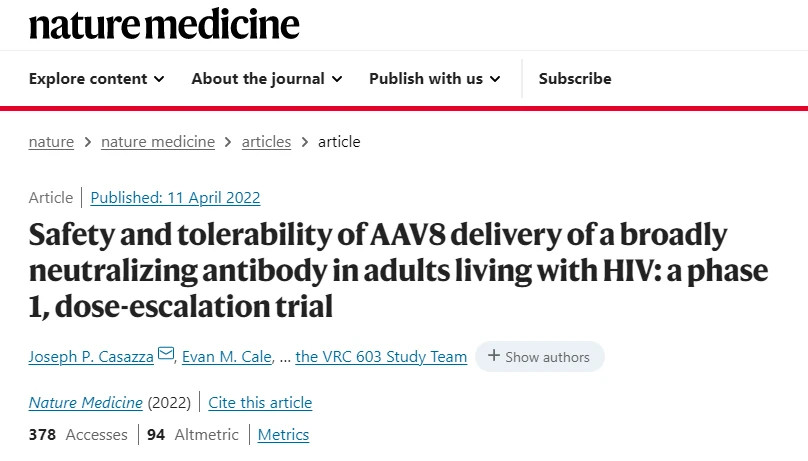 近日,应用该策略进行的临床试验产生了令人鼓舞的结果,并于4月11日发表在国际顶尖医学期刊 Nature Medicine 上:Safety and tolerability of AAV8 delivery of a broadly neutralizing antibody in adults living with HIV: a phase 1, dose-escalation trial 。