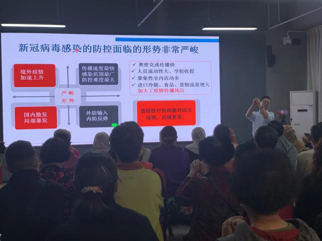 科普宣传成员用自身经历讲述了到瑞丽、武汉抗击新冠肺炎的经历和新冠病毒的特性及危害,并通过大数据和相关询证科学的论文,向大家阐述了老年人接种疫苗的重要性及迫切性。科普宣传成员还在现场为广大老年人分析和评估了新冠疫苗接种的适应症和禁忌症,最后强调了手卫生、戴口罩、保持社交距离的防疫措施。一些对疫苗接种仍有疑虑以及对疫苗接种不理解、抵触的老年人在听完科普宣讲后,纷纷表示将积极完成新冠疫苗接种。