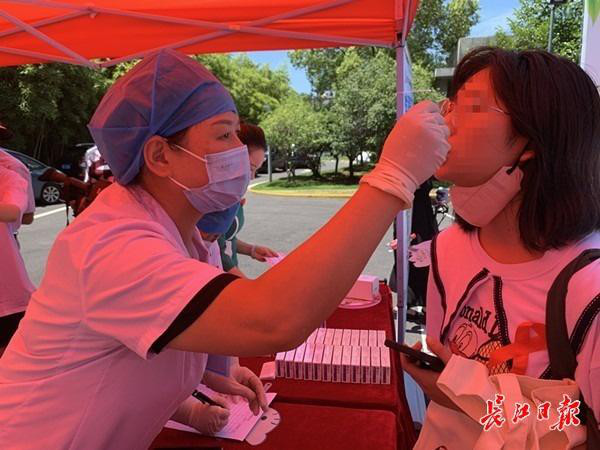 长江日报大武汉客户端7月22日讯 用小刷子刮一刮牙龈,即可快速识别HIV感染。7月22日,武汉市疾控中心联合经开区卫健局、区疾控中心举行的艾滋病防治宣传教育“进企业”系列活动,首站走进武汉凯骏服装集团有限公司。现场检测咨询台前,很快被职工群众打了围。