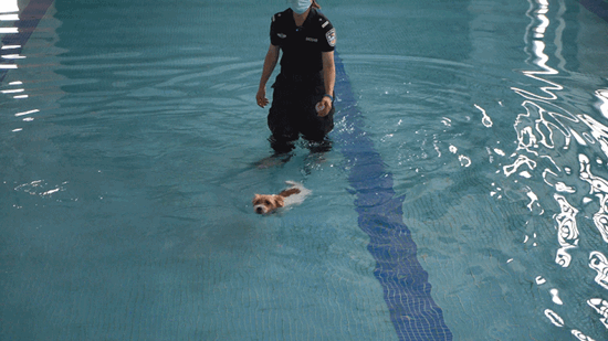 今年夏天“小玖”还学会了游泳,即便它有些怕水,而且腿很短,但是经过一段时间的训练也能游得不错。