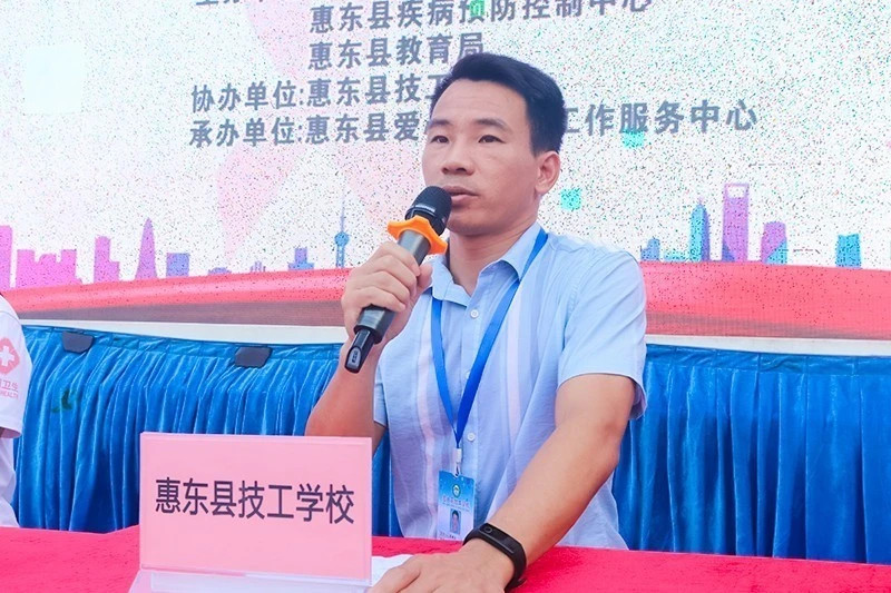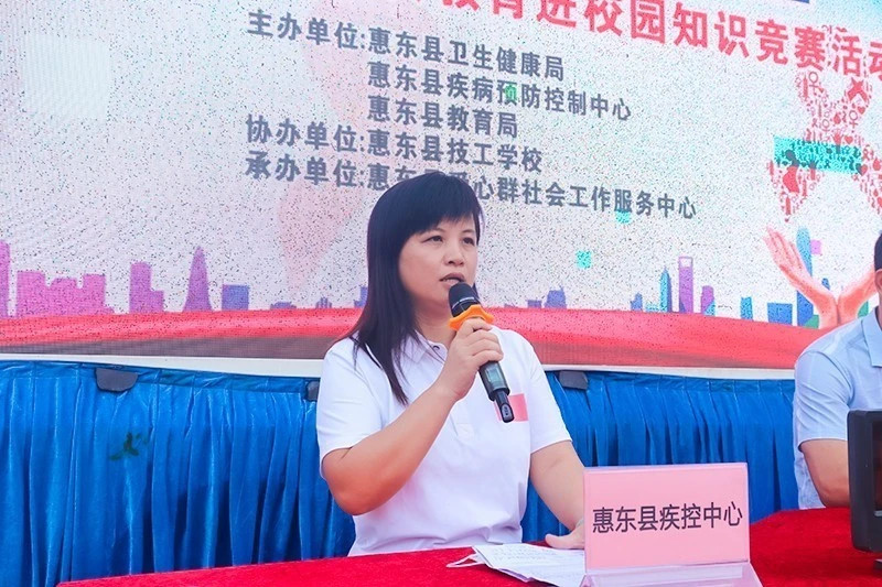 惠东县疾控中心艾滋病防控科副科长戴瑞芳致词,她分析了当前艾滋病流行与防治形势,指出了艾滋病防控工作的方向和途径,勉励学生要主动承担社会责任,发挥青年在艾滋病防治斗争中的主力军作用。