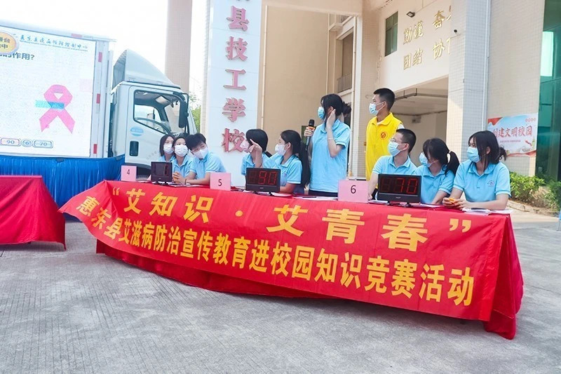 为增强青少年群体的防艾意识,提高青少年预防艾滋病的自觉参与性,营造校园内人人参与预防艾滋病的良好氛围,9月25日上午,由广东省惠东县卫生健康局、惠东县疾病预防控制中心、惠东县教育局主办,惠东县技工学校协办,惠东县爱心群社会工作服务中心承办的“艾知识 艾青春”惠东县艾滋病防治宣传教育进校园知识竞赛在惠东县技工学校开展。