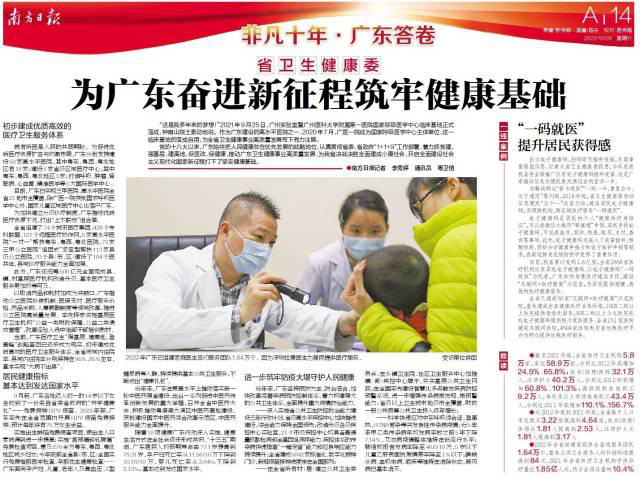 当前,广东医疗卫生“强基层、建高地、登高峰”战略蓝图已逐步成为现实,初步建成优质高效的医疗卫生服务体系,全省市域内住院率、县域内住院率分别保持在95%、85%左右,基本实现“大病不出县”。