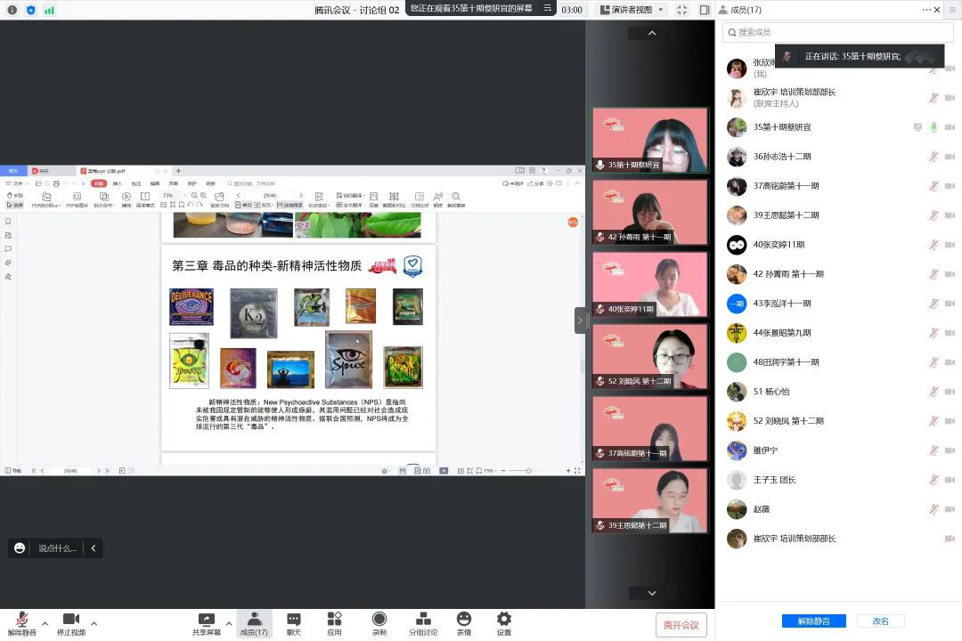 活动开始,几个禁毒视频引入大家对毒品的认识和思考。在纪录片《与死神共舞》中,年龄很小的学生、花季少女、已经成家为人父母的中年……形形色色的吸毒者异常的精神状态,甚至走向死亡的结局让人毛骨悚然又感到痛心。在观看过程中,成员们初步认识了毒品在生活中常见的伪装、毒品带来的危害,也坚定了在禁毒宣传科普道路上前行的信念。