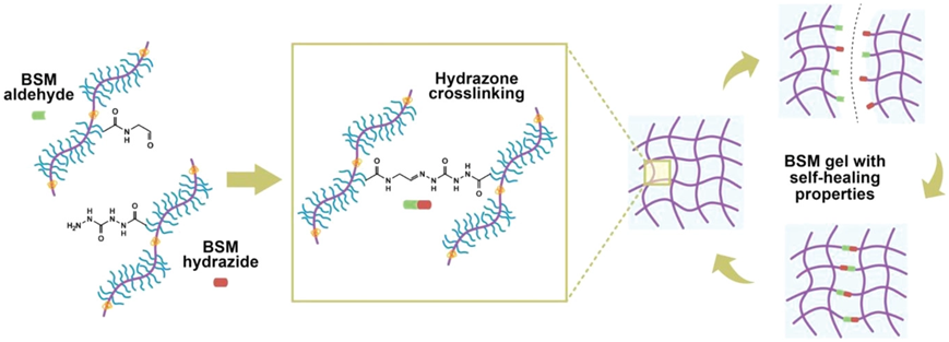 动态共价腙键形成牛颌下腺粘蛋白(bovine submaxillary mucins, BSM)凝胶的示意图。图片来自Advanced Science, 2022, doi:10.1002/advs.202203898。
