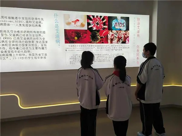 同学们先后在艾滋病预防中心展厅、禁毒展厅自由参观。展厅内有许多艾滋病相关科普知识,还有通过拼图游戏有奖问答活动等趣味方式来对防艾知识进行展示,提高学生兴趣,加深印象。防艾馆参观结束后,工作人员将馆内展示内容进行概括性总结,带领学生了解艾滋病传播方式,同时详细介绍了现代各种新型毒品及其危害,并向同学们展示模具。