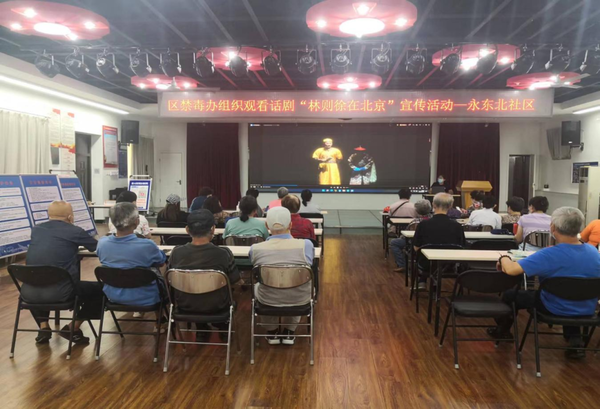 八宝山街道向日葵社区工作人员组织永东北社区居民观看禁毒曲剧《林则徐在北京》,林则徐克服重重困难开启禁烟之路的英勇气概感染了广大观剧群众。同时,工作人员还向观剧居民发放了禁毒宣传手册、禁毒宣传品,让居民进一步认识到了毒品的严重危害性,增强了广大居民群众的禁毒意识和拒毒能力,营造出了浓厚的社区禁毒氛围。