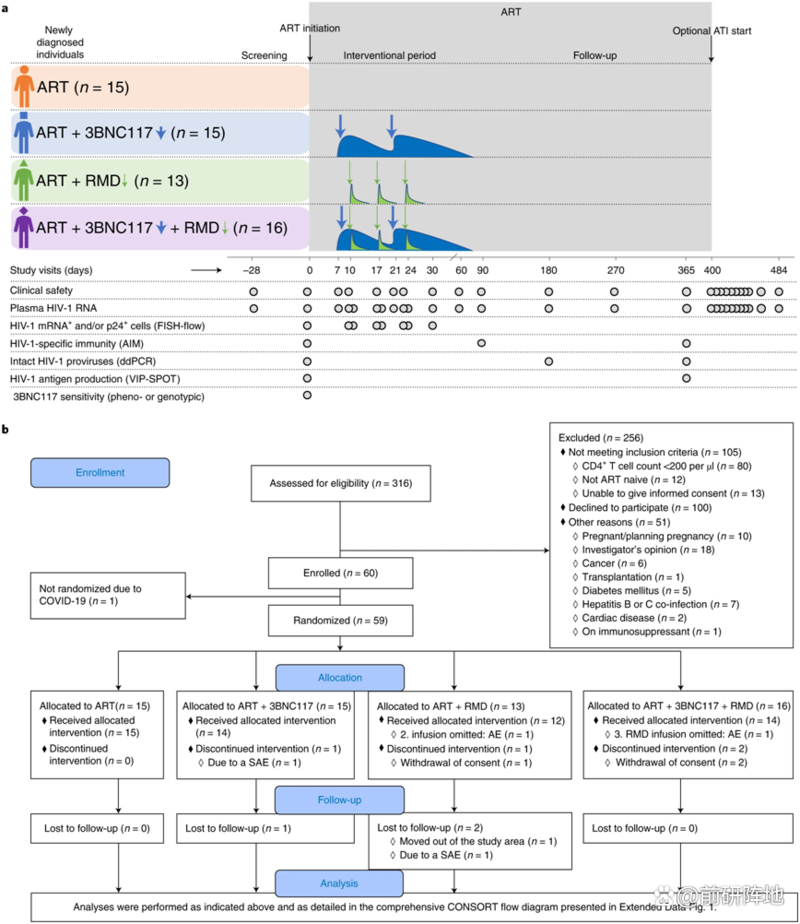 在这项临床试验中,这些作者调查了在ART药物治疗开始后不久,用一种具有CD4结合位点的单克隆抗HIV-1抗体3BNC117对新诊断的HIV-1患者进行早期干预,然后用一种组蛋白去乙酰化酶抑制剂romidepsin,是否会改变HIV-1感染的进程(NCT03041012)。该试验在丹麦的五家医院和英国的两家医院进行。主要终点是分析初始病毒衰减动力学和从基线到第365天含有完整HIV-1前病毒的CD4+T细胞的频率变化。次要终点包括从基线到第365天受感染的CD4+T细胞和病毒特异性CD8+T细胞免疫力的变化、ART药物治疗前血浆HIV-1 3BNC117敏感性、安全性和耐受性以及从第400天开始的12周分析性ART药物治疗中断期间失去病毒学控制的时间。