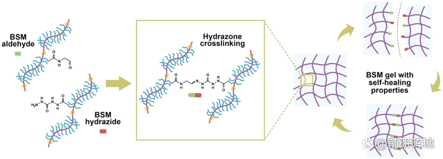 动态共价腙键形成牛颌下腺粘蛋白(bovine submaxillary mucins, BSM)凝胶的示意图。图片来自Advanced Science, 2022, doi:10.1002/advs.202203898。