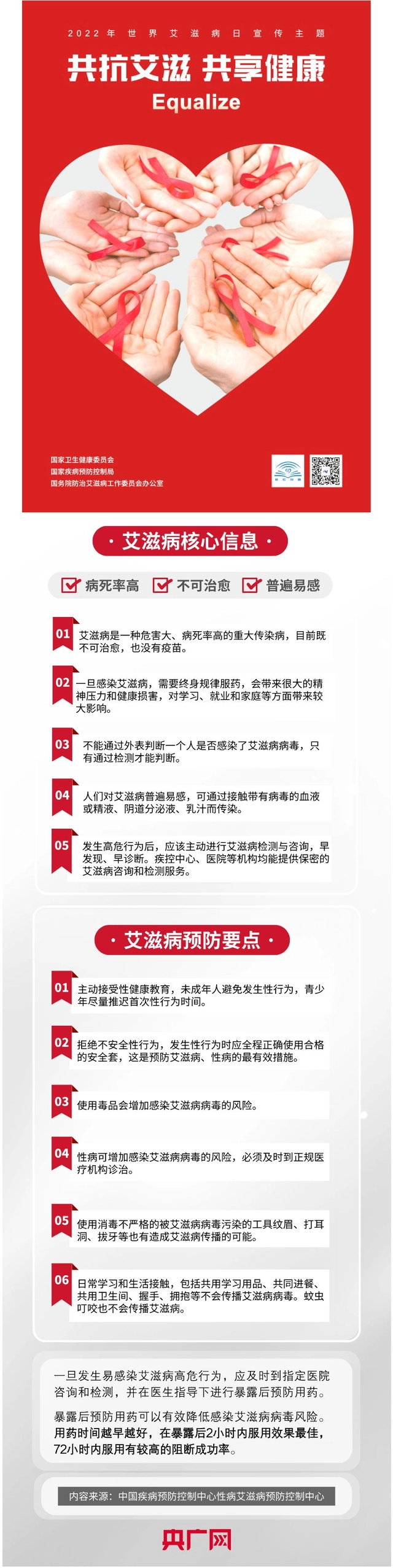 2022年12月1日是第35个“世界艾滋病日”,今年我国宣传活动主题为“共抗艾滋 共享健康”。艾滋病是全人类面临的共同挑战,我们需要对艾滋病的传播保持警惕,学习掌握性健康知识,提高自我保护意识与技能,做自己健康的第一责任人。同时,也应了解艾滋病的规范治疗,正视患病人群。毕竟,比疾病本身更可怕的,是无知和偏见。