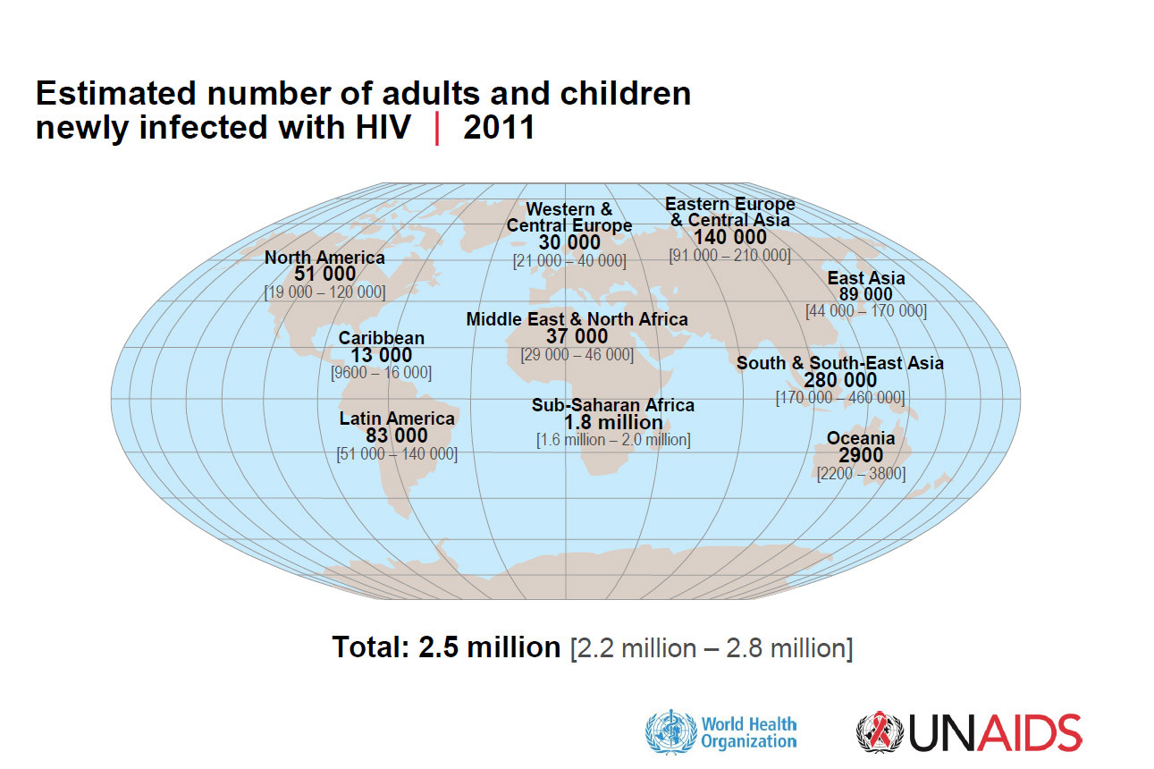 至2011年底,全球约有3400万人感染艾滋病病毒(HIV),年度新发感染者约250万,比2001年下降了约20%。抗艾形势总体向好,但各国家和地区的情况也不尽相同。