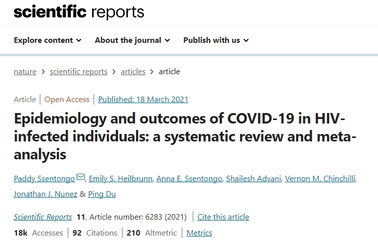 《Scientific Reports》上一项研究得出的结论是:艾滋病患者感染COVID-19并死于COVID-19的风险更高[1]。该研究评估了此前进行的22项有关研究,涵盖来自北美、非洲、欧洲和亚洲的约2100万名参与者。