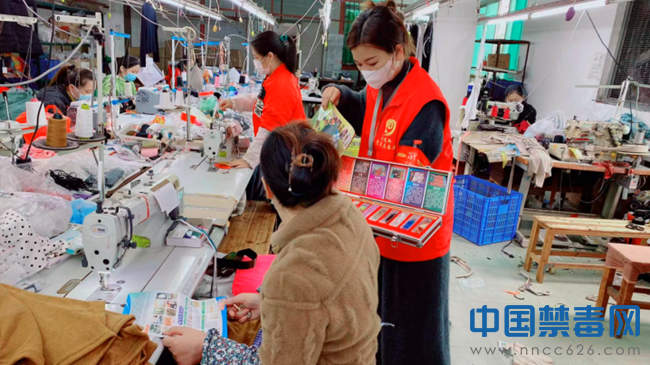 中国禁毒网讯 为拓宽禁毒宣传覆盖面,提高工人对毒品认识,自觉抵制毒品危害,12月19日,广东省广州市番禺区大龙街禁毒办联合区禁毒办、傍江东村走进辖区工厂,开展以“无毒工厂,你我守护”为主题的禁毒宣传活动。
