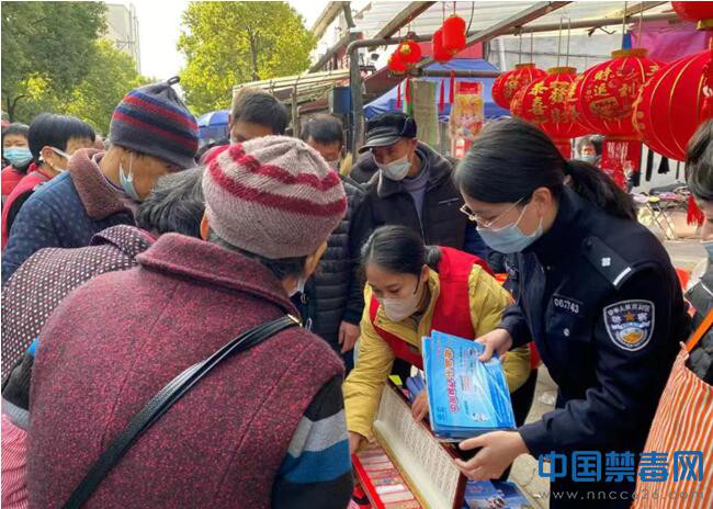图为禁毒民警向群众发放禁毒宣传折页。中国禁毒网发