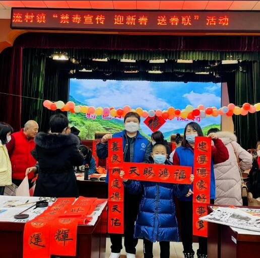 流村镇禁毒领导小组办公室联合镇市民活动中心、北企公司禁毒领导小组办公室在流村镇活动中心组织开展以“禁毒宣传、迎新春、送春联”为主题的禁毒普法宣传活动,书法家们挥毫泼墨,用多种字体书写了100多副春联和福字,并送到了村民手中。在送春联过程中,禁毒社工也向村民们科普了预防毒品危害的重要性及识毒、拒毒的方法,告诫广大村民一定要增强起自觉远离、抵制毒品的意识,和家人们一起过一个健康、祥和、无毒的春节。