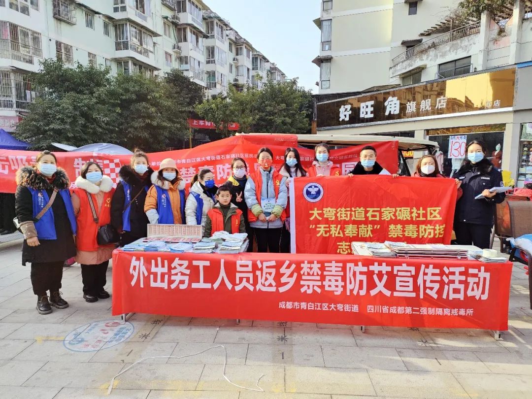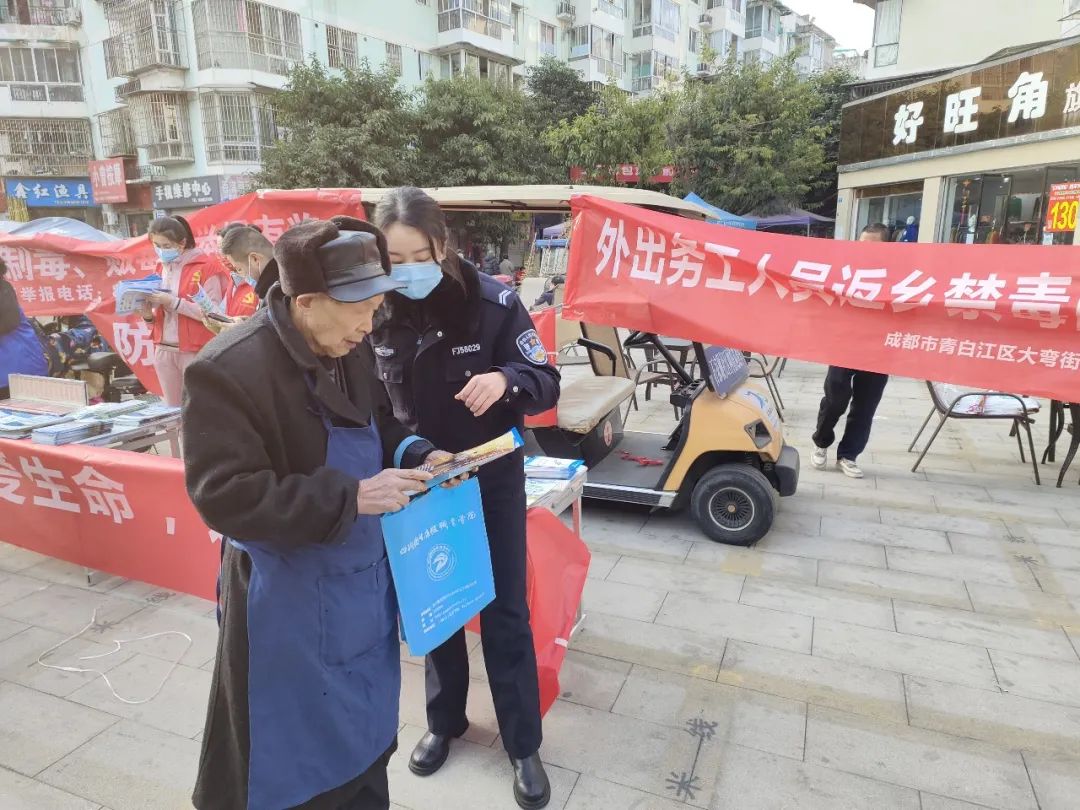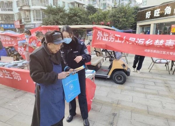 针对春节将至,外出务工人员陆续返乡的实际,1月18日,四川省成都第二强制隔离戒毒所联合青白江区街道、公安、司法等部门在青白江区花鸟市场开展外出务工人员返乡禁毒防艾宣传活动。