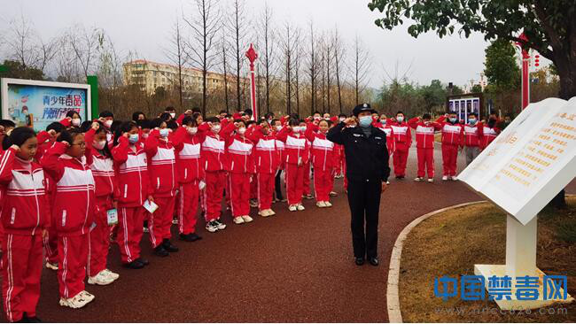 禁毒民警一边引导大家参观道路两旁的禁毒宣传牌,一边通过列举因吸食毒品给家庭及身心健康带来严重危害的典型事例,让学生对毒品、种类、危害进行更深的了解与认识。在禁毒宣誓誓词碑前,民警带领学生进行禁毒教育承诺宣誓。